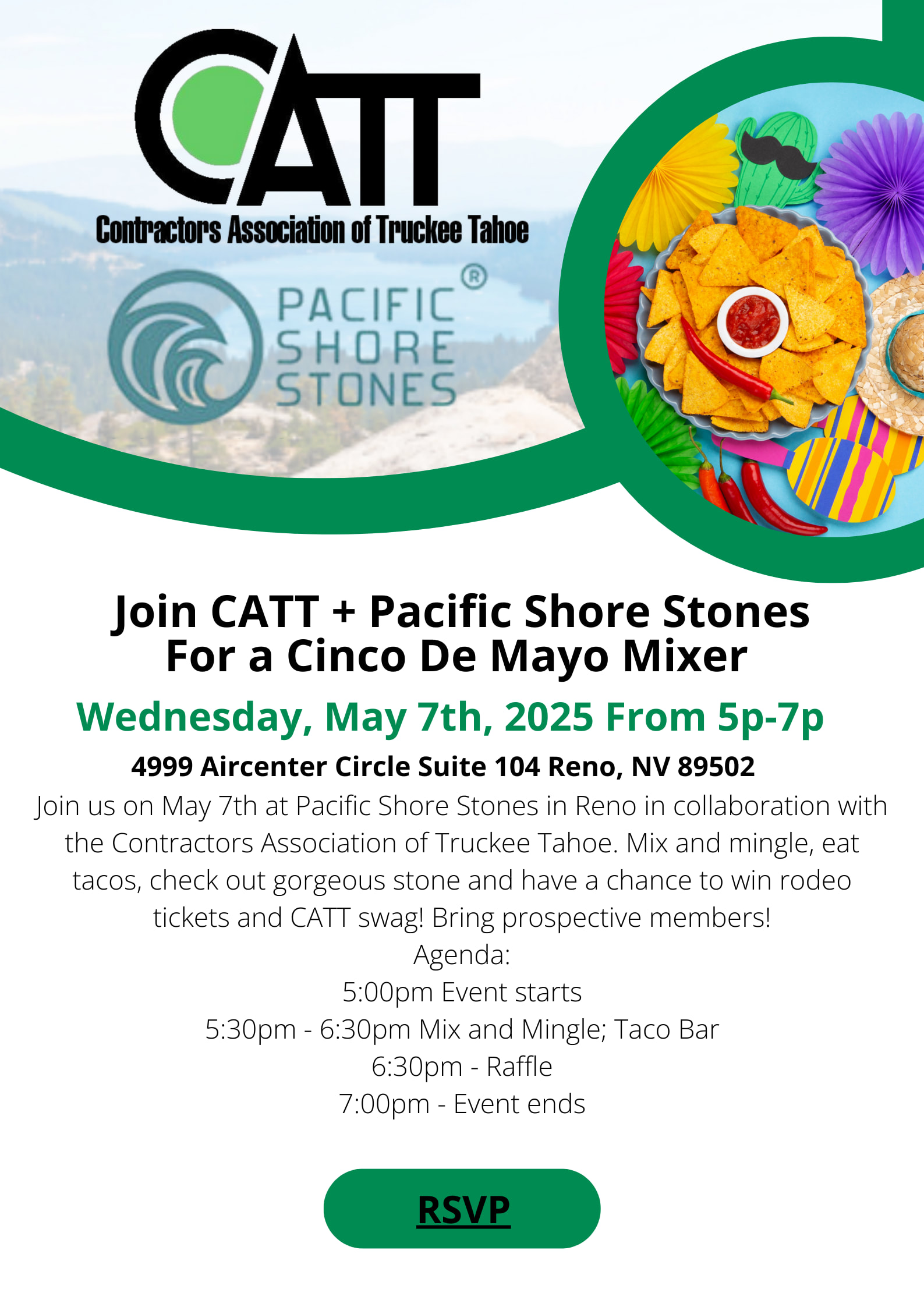 Annual Pacific Shore & Stone Mixer – CATT Join CATT for our annual networking event hosted by Pacific Shore & Stone. Connect with local contractors, builders, and industry professionals while exploring the latest in stone and surfacing products. Enjoy refreshments, hands-on demonstrations, and a relaxed setting designed to foster collaboration and strengthen relationships across the Truckee‑Tahoe construction community.Images